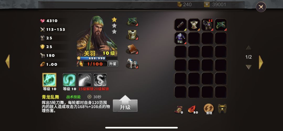 首次打这关只能使用关羽、张飞,防御塔选择天雷塔、剧毒塔,战术卡使用练兵、术塔精通、剧毒新星、箭塔精通,关羽、张飞装备如图所示