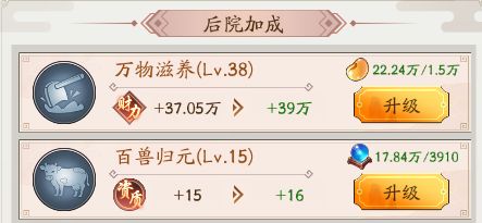 经营都是后院加成的属性,是在进入家族之后才有后院的,升级的材料消耗都是后院产物贩卖之后的资源,万物滋养是增加赚速的升级消耗灵豆,农作物贩卖就可以获得,百兽归元升级可以增加1的资质,升级消耗兽元,贩卖养的动物获得。