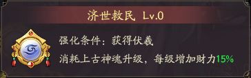 第二个技能,济世救民,每升1级会提升伏義百分之15的财力值,升级是要消耗10个上古神魂的,上古神魂就是兑换上古传说门客的道具10个可以换一个门客,应该先全部兑换激活百分之125之后在去看要不要升级这个技能,一级之增加百分之15少太多了。