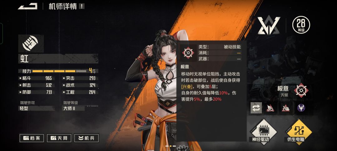 技能携带建议是升龙拳跟意气风发(主要是配合机甲,机甲带来的暴击率回避率buff基本可以常驻),后期伏虎式、崩山、意气风发。