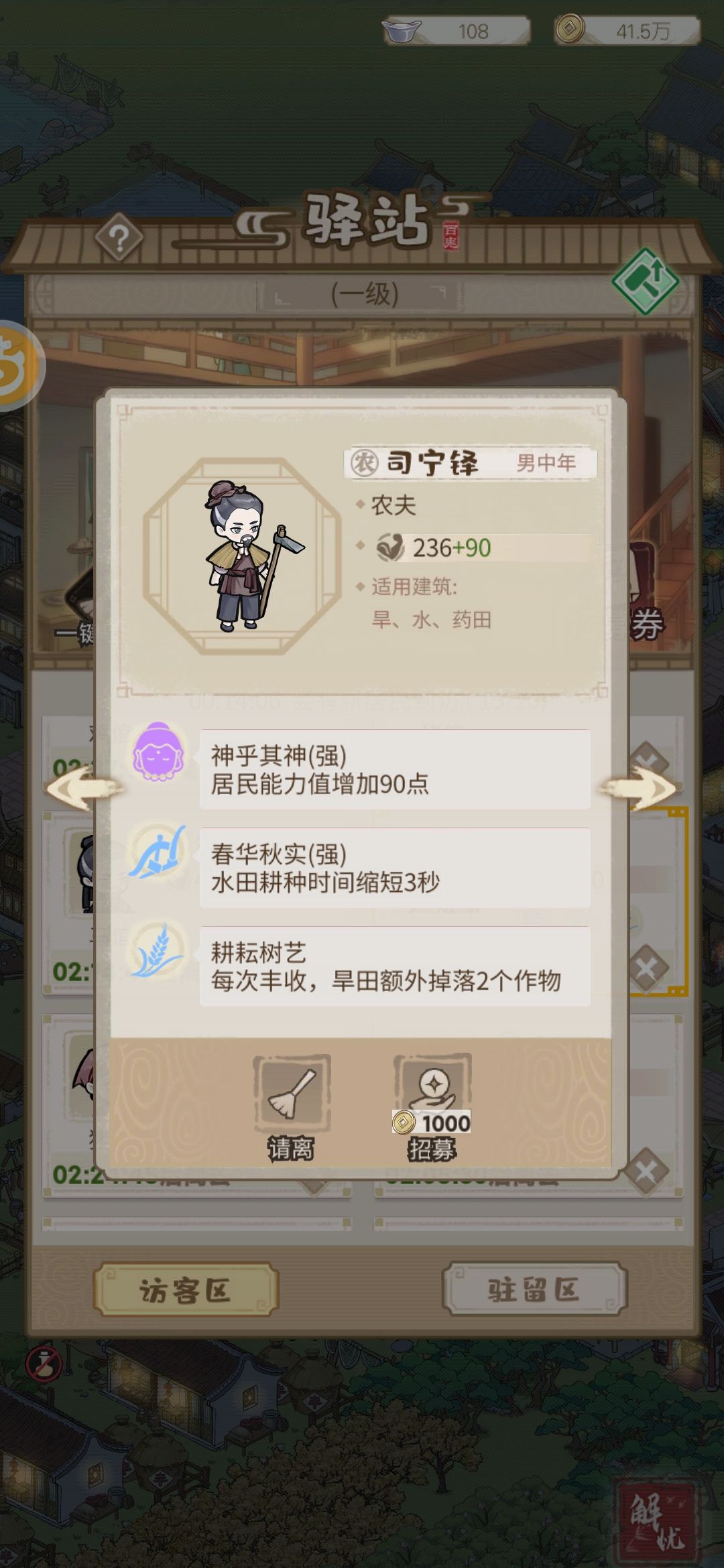 利于一解锁新房子上限就拉满人住进去(有金色居民【这个贵些】和普通居民),有好技能的居民最香(如下图加额外产量的),没好技能的可以追求下高能力值的金色居民。
