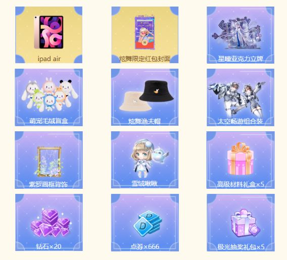 每成功邀请一位buff玩家即可随机增加1个公测币或稀有公测币(该任务获取公测币或稀有公测币上限为5次),成功邀请的buff玩家完成一个成长任务即可随机增加1个公测币/稀有公测币。稀有公测币可用于兑换实物iPad air,公测币可兑换炫舞限定红包封面(红包兑换链接可在“获奖记录”中查询,兑换先到先得)、星瞳亚克力立牌、萌宠毛绒盲盒、炫舞渔夫帽、太空畅游组合装、紫萝画框背饰、雪绒啾啾、高级材料礼盒*5、钻石*20、点券*666、极光抽奖礼包*5等奖励~