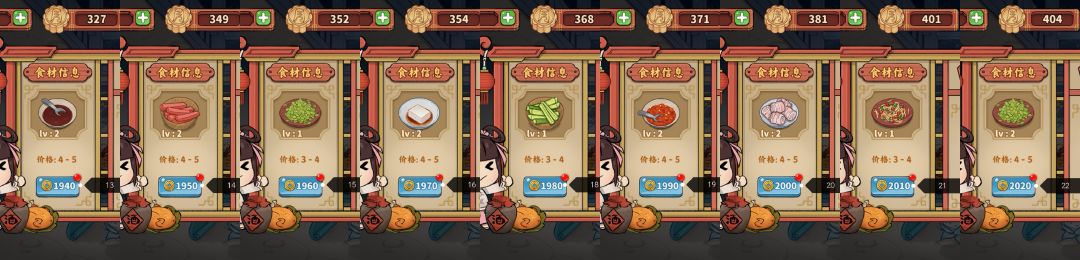发现厨具或食材每次升级需要的金币都呈等差数列,这样只要知道每关厨具或食材要升级多少次和首项公差就知道总共要多少金币了,挺有意思的