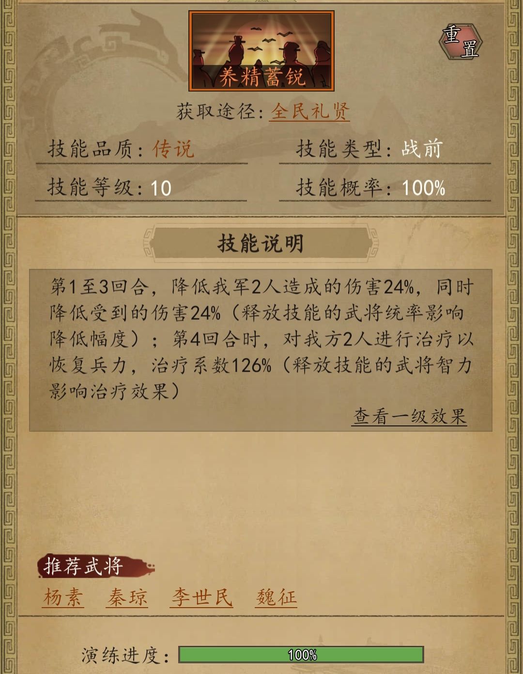 养精蓄锐我很早就换了,个人感觉有点用但又有点鸡肋。因为带了养精蓄锐就不好再带暂避锋芒了(怕减伤溢出太多浪费格子),但是如果你不带暂避改云龙或骄兵(亦或两个都带)的话,养精蓄锐本身系数较低,减伤又叠不满(本来也不一定给到贺若弼)。更要命的是减伤效果只有3回合,3回合后只有一个治疗效果,这个奶量本就不明显,不如救死扶伤的同时还受禁疗影响。总结:这个技能减伤和治疗方面都差点意思,让我不好搭配其他技能,所以我索性不带了。