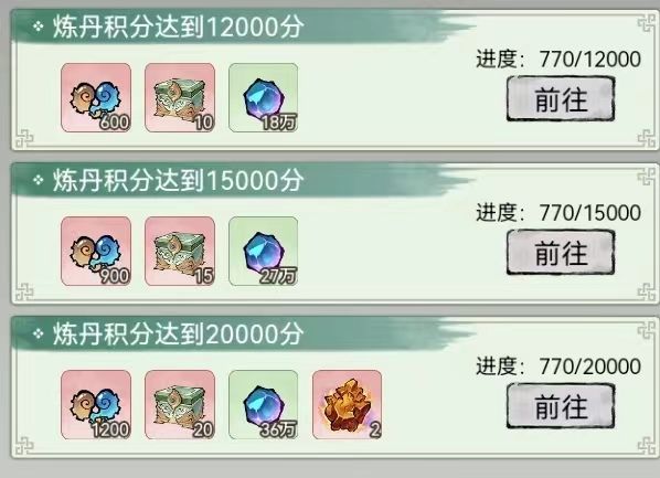 一轮炼丹需要两万炼丹积分,共有四轮共八万积分,一轮有50红品质盒子、3750机缘,通玄子保底两轮100个红品质盒子,红品质盒子2%出通玄子,黄品质盒子只有通玄子碎片,活动盒子有1%的8888机缘。