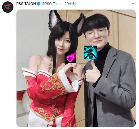 出席活动结束后,在后台cos阿狸的小姐姐与Faker合影留念,小姐姐在左边摆出爱心的手势,Faker大魔王站在右边竖起大拇指。PSG官方直接P图搞事。