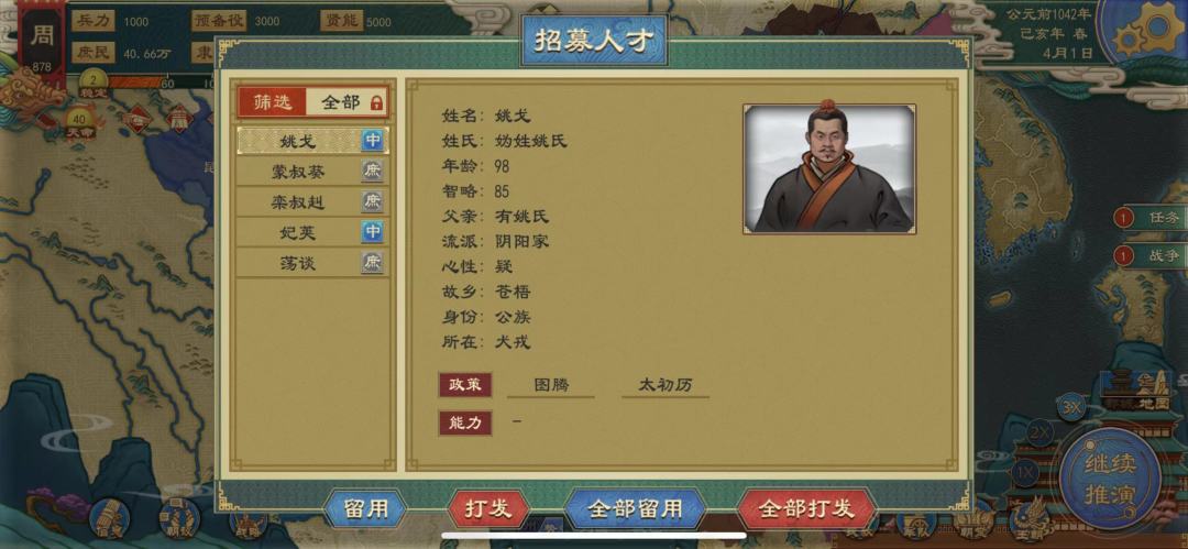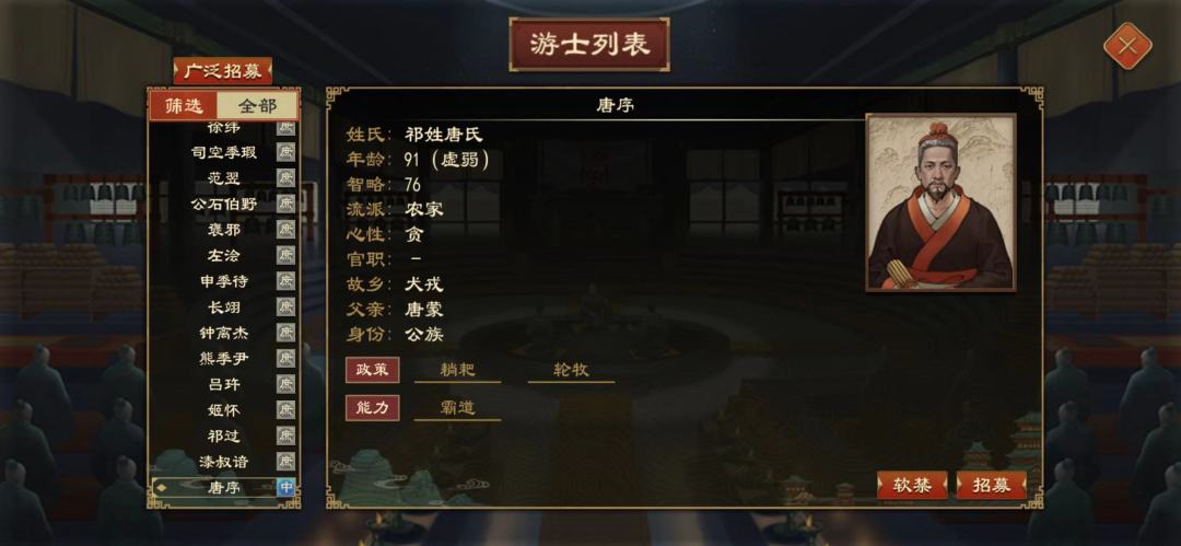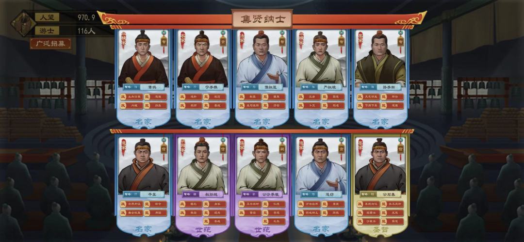 当本国人才吸引力提升至一定程度时,天下的贤人将往我国聚集,游士中出现适合的人才时,玩家可以选择招募,但招募存在被拒接的几率