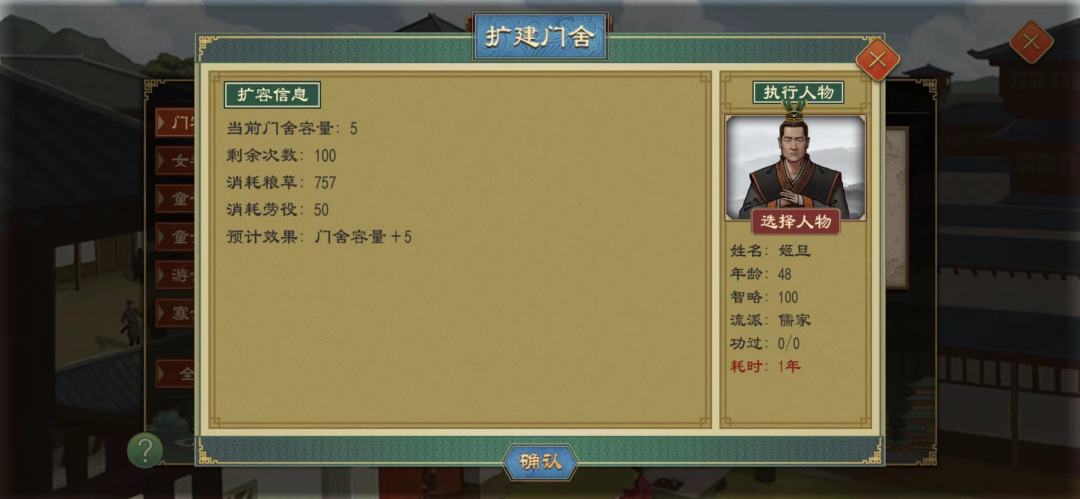 需要注意的是,门舍容量有限,当门客数量大于上限时,门客容易离开,且无法进行荐贤操作。因此各位玩家在游戏前期即可以开始扩建门舍,并适当驱逐部分不会使用的门客。