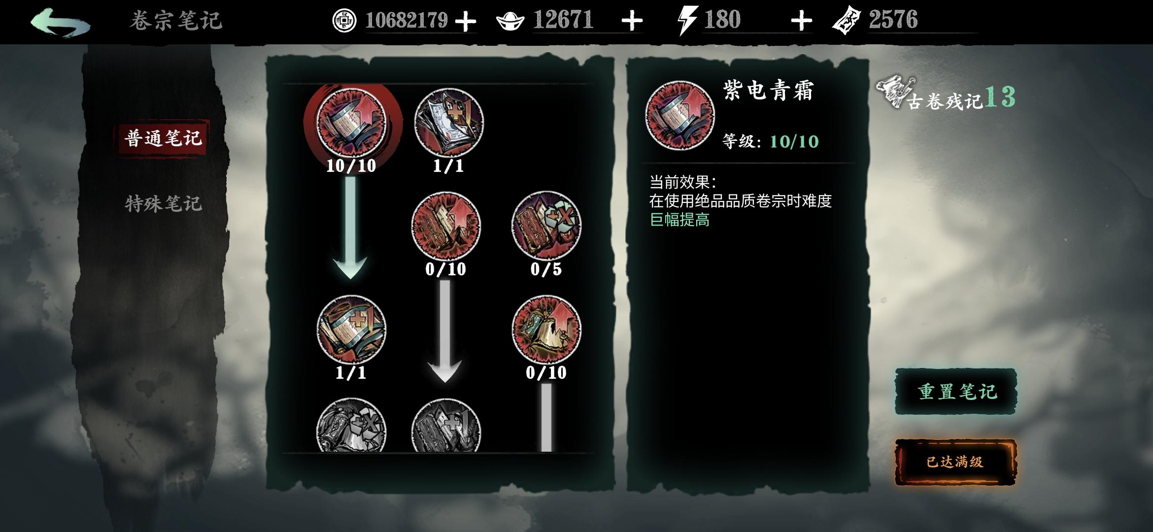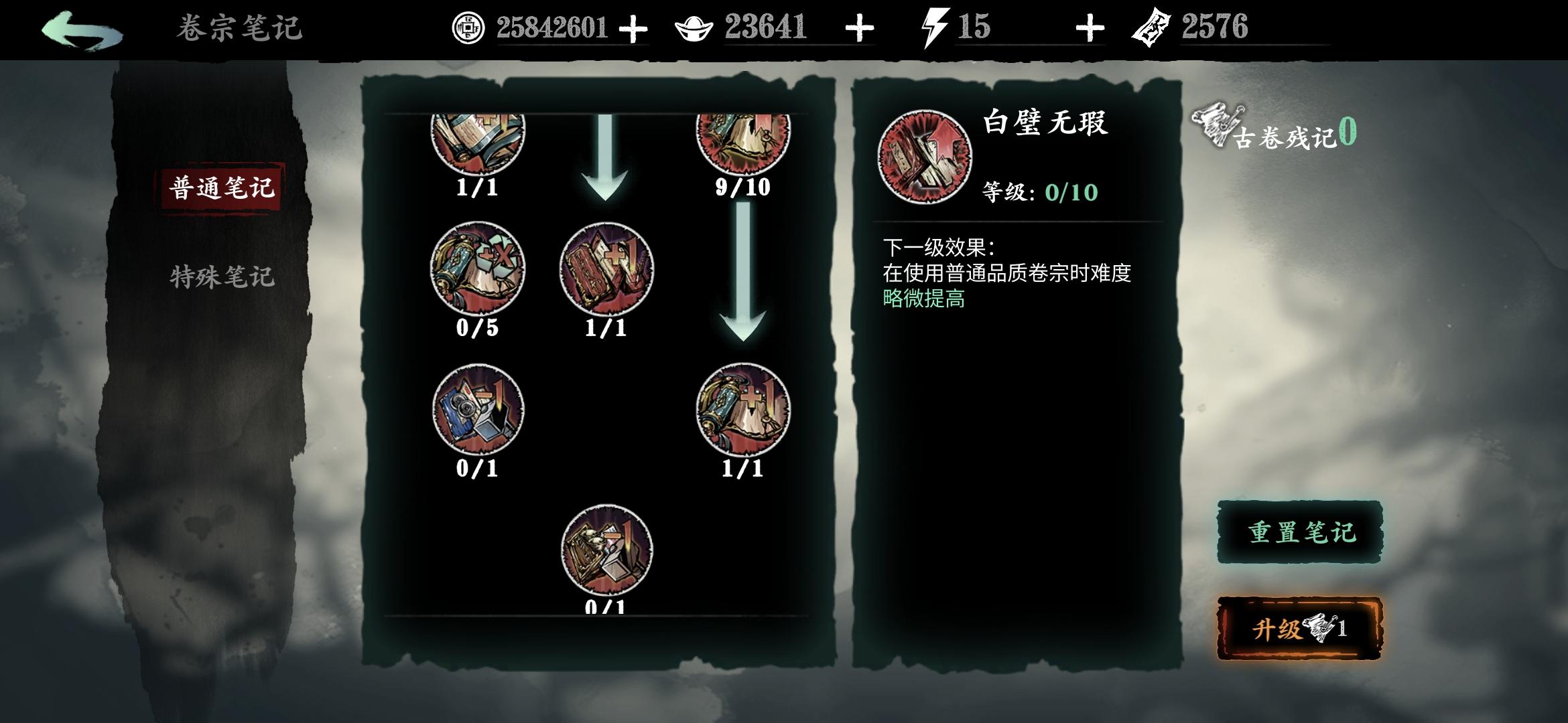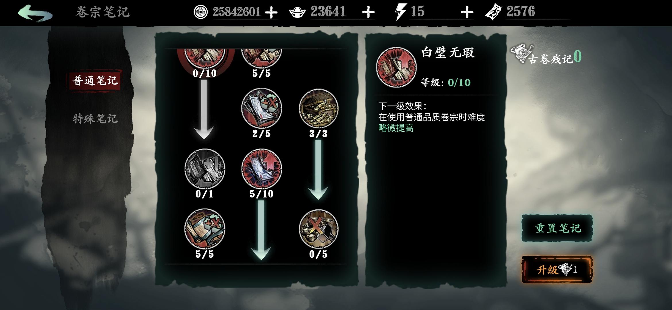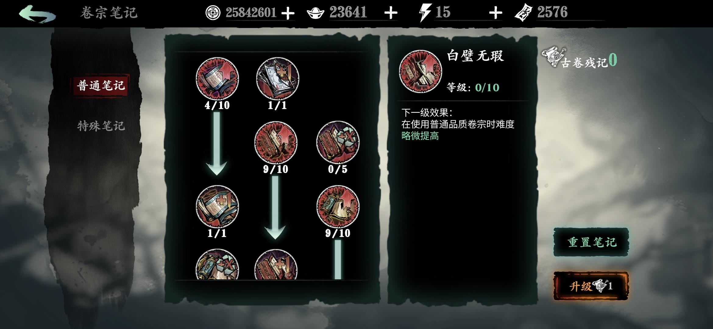 分享一个常用笔记点法,可以让传说和极品逆天卷子变凐灭,缺币分解卷子时重新点笔记(卷宗回收时获得的残页)点满。