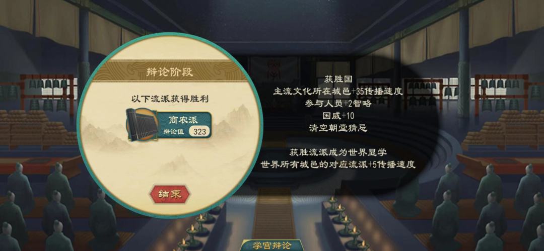 ④国中群贤:宗亲、朝臣、门客、游士有几率增加0~2智略,成功增加后人物智略不会超过95;都城该圣人流派文化量+100