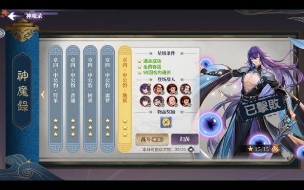 而我们主要需要攻略的还是神魔录第四关地狱难度,这一任务的要求同样是通关即可,不要求全员存活,因此我们可以首先通关这一难度,等战力有了较大提升再三星通关。