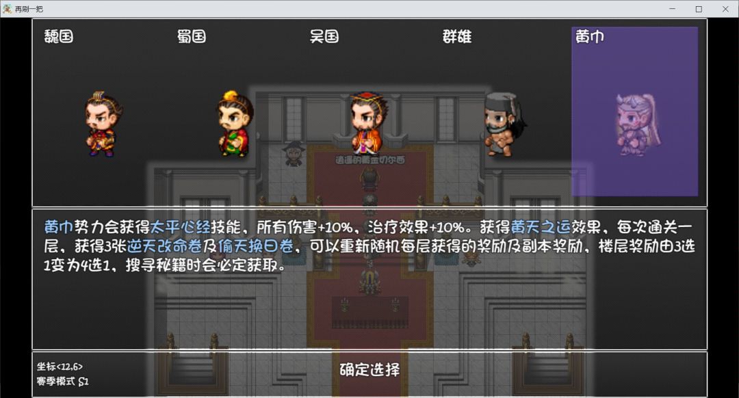 黄巾 目前来看是很好的一个选择。太平心经加成伤害和治疗还是不错的,每层额外有券和4选1能节省很多sl的时间,搜寻秘籍必得,神技!