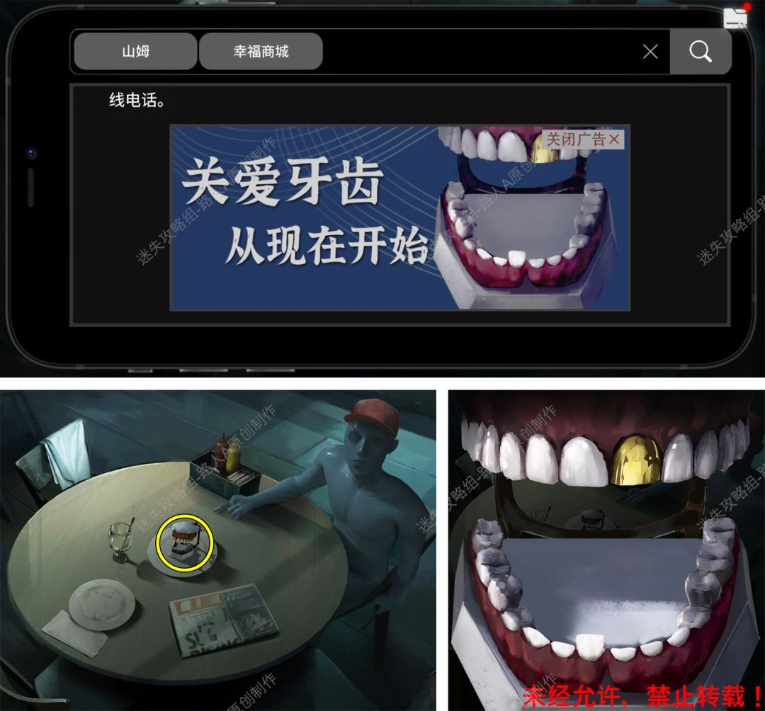 30.用手机搜索【幸福商城 + 山姆】,根据牙齿广告的线索,调整餐桌上的假牙,得到【金牙】。30.1