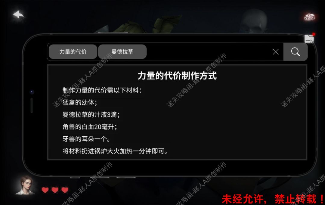 23.尝试拔出桌上的曼德拉草,用手机搜索【力量的代价 + 曼德拉草】,得到需要的材料清单。23.1、23.2