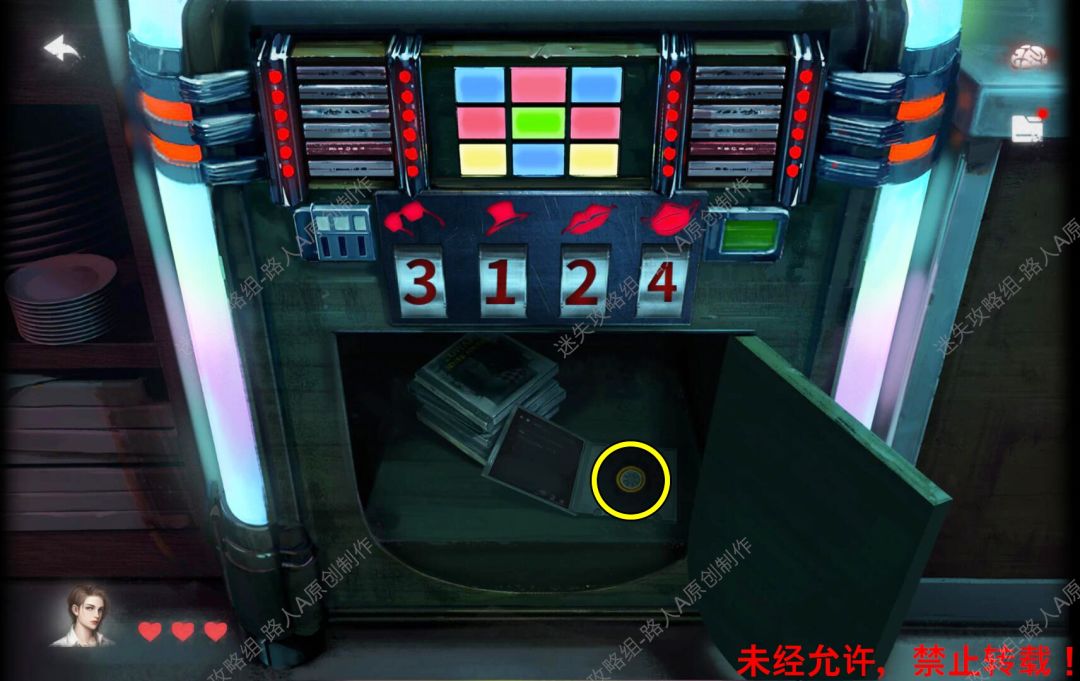 25.根据4个假人的线索,在吧台的点唱机输入密码【3124】,得到【光盘】。(戴口罩假人的手被叶子遮挡,确保之前尝试过拔出曼德拉草,看到假人的手势。)25.1、25.2
