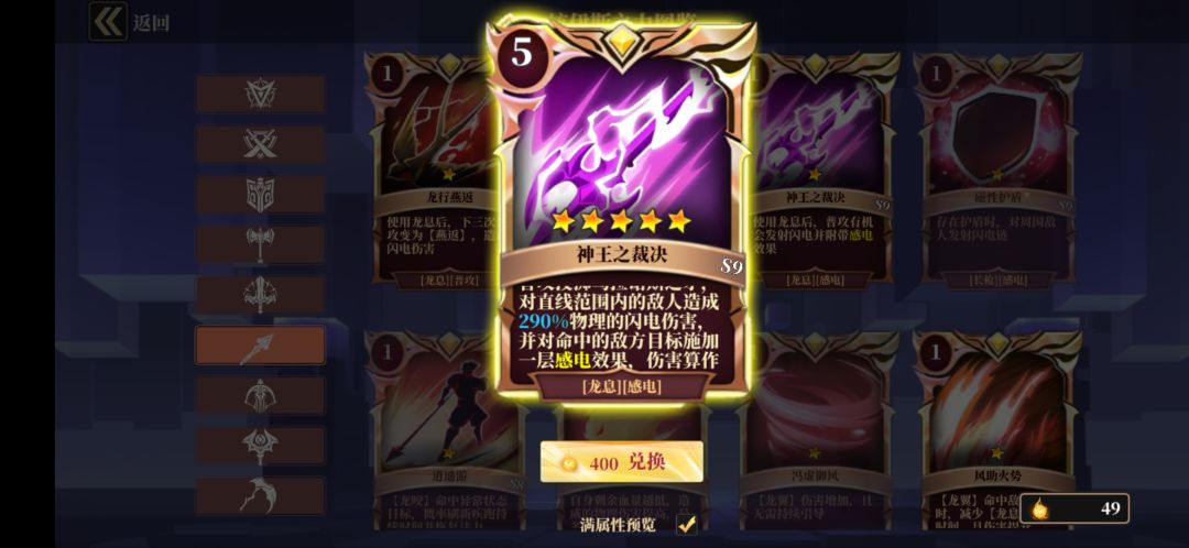 本赛季伤害手段是元素反应,枪还是比较占优势的,以神王龙行枪为例,核心技能是龙息,其他技能可以根据卡牌自己搭配。枪技能本身龙息有一段击飞,怒吼可提供恐惧,有上面两张卡可以提供感电。