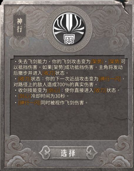 巴拉巴拉说一大堆实际上就是要像只狼一样进行弹反的操作,而神行专属的单独百分之七百的离谱乘区和其流派的专属被动的离谱面板二者合二为一的最终结果则是让神行可以轻松具备秒天秒地秒空气的能力,其一闪伤害则是由飞剑和近战伤的百分之五十构成,因此神行全伤近战飞剑伤一样是都可以拿的,虽然可以轻易秒怪,而问题就出现在弹反这一操作上,很多新手在刚上手时经常会因为掌握不好弹反时机反复失误而将弹反变为单方面挨打