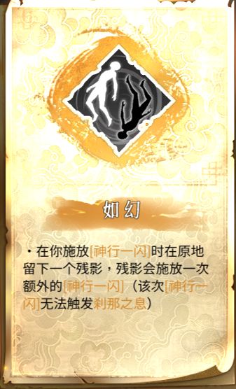 这个勉强可以相当于将一闪的伤害翻了两倍,不过残影的第二下通常是无法触发不二打和斩龙决的,所以第二下的伤害相较于第一下会大打折扣,不过这并不妨碍如幻本身能为神行带来高增幅的事实,而且这也算间接提高了神行的攻击频率了,使其在打鹤家第二形态时不至于太过坐牢。![[嗒啦啦4_比心]](https://img.tapimg.com/market/images/d28961d9ef2d62e62333b8d17a8612dc.gif)