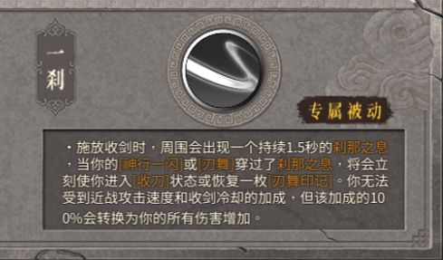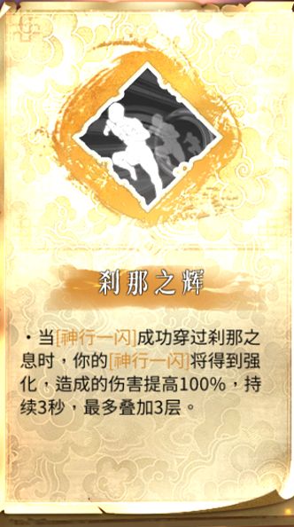 这个相比前两个就稍显鸡肋了,虽然其伤害加成十分可观,但是想叠满三层的先决条件就是一刹即永恒,也就是说在没有一刹即永恒的情况下选刹那之辉就基本相当于白板技能,而通常情况下神行的第一下一闪就足够将敌人缪撒了,后面的加伤则很少有用武之地,这也是其鸡肋的原因所在![[嗒啦啦4_无语]](https://img.tapimg.com/market/images/90d90843e83883e5c9bc4155bcc4c99b.gif)