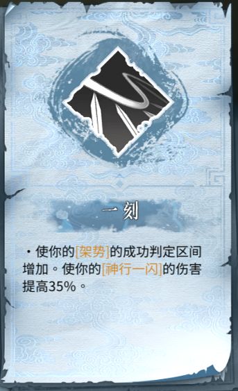一刻的优先级我个人认为是比金色技能书还要高的,毕竟神行主要的输出手段便是一闪,掌握弹反这一前提条件才能有效提高神行的输出效率,而一刻刚好可以显著提升神行的弹反体验,可以使刚上手神行的玩家不至于将弹反变成单方面挨打,因此看到一刻是绝对不能错过的![[嗒啦啦2_嗯嗯]](https://img.tapimg.com/market/images/20f6af9b26bad035974395636f475bb9.gif)