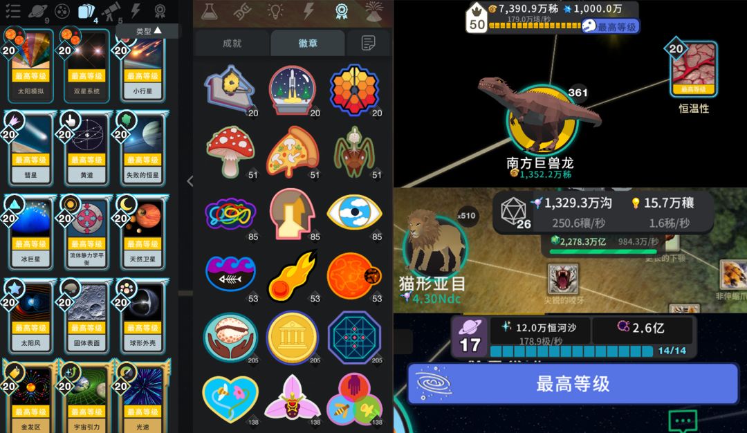 中间的徽章是通过玩限时活动奖励的,而每拿一个徽章,所有模拟都会有1%的生产加成(包括主宇宙、超越、恐龙谷),目前集了1647个徽章,也就是给所有模拟的产出加成了1647%,乘了17倍,当然也有更肝的大佬加到了30倍。
