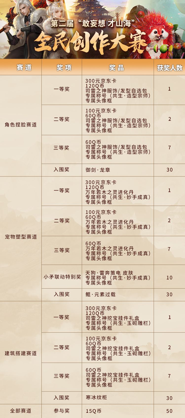 【参与奖】将从全部三个赛道投稿的过审但未入围的作品中,随机抽取50份作品,其作者可获得15Q币奖励。