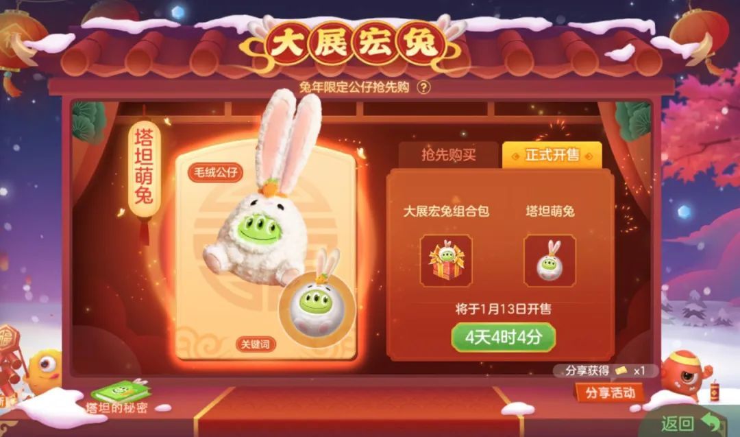 1月13日20:00塔坦萌兔游戏内正式开售!购买大展宏兔组合包即可获得兔年限定公仔-塔坦萌兔*1和兔年限定关键词-塔坦萌兔*1,定好闹钟来游戏里面把杨超越同款塔坦萌兔带回家。