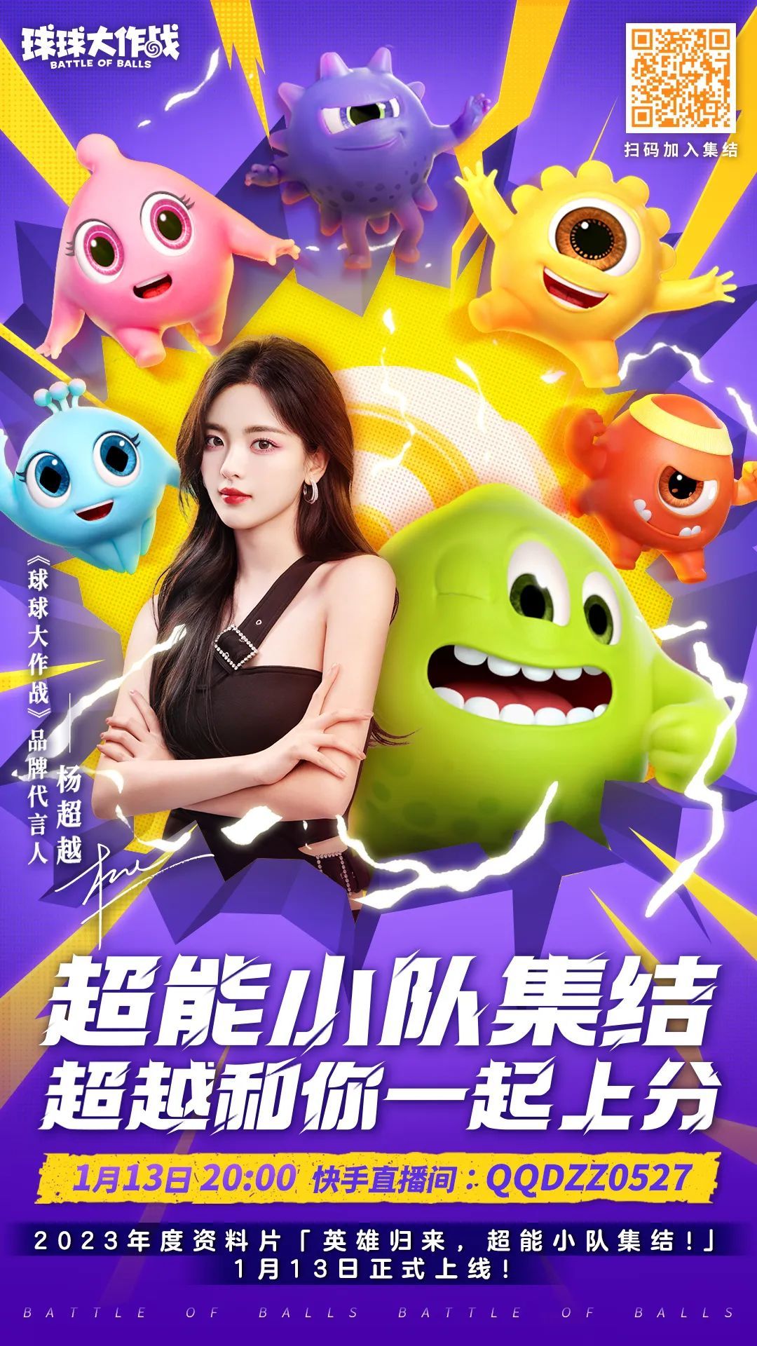 1月13日20:00,杨超越亲临球球大作战快手直播间(快手号:QQDZZ0527),和球宝们一起体验全新玩法“超能大逃杀”,还将在直播现场随机抽取幸运球宝送出iPhone14、杨超越签名照、兔年限定公仔-塔坦萌兔等海量福利。
