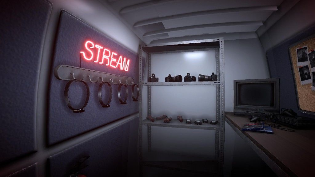 在小货车里,有头戴相机、手持相机和音压计,可以用来测量你和幽灵之间的距离。头戴相机是为了让你为观众直播用的,你也可以用来拍摄幽灵和恶魔的照片,然后在社交媒体上分享从而在游戏中获得点赞。手持相机可以眩晕游戏中的Boss幽灵,在他们的眼睛被射瞎的同时,你可以趁机逃走!