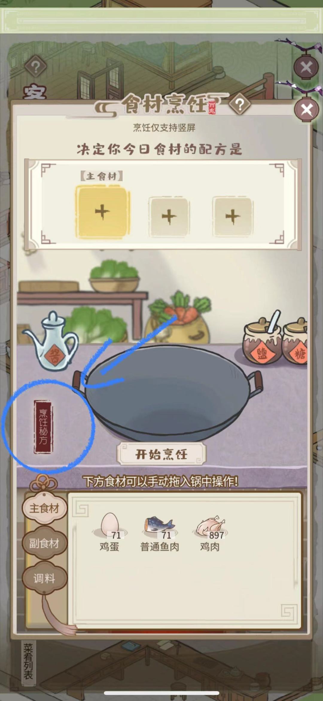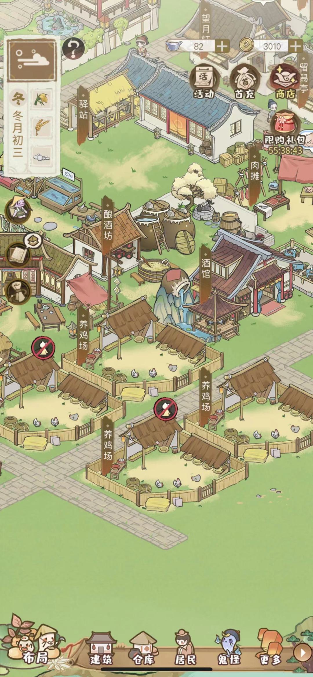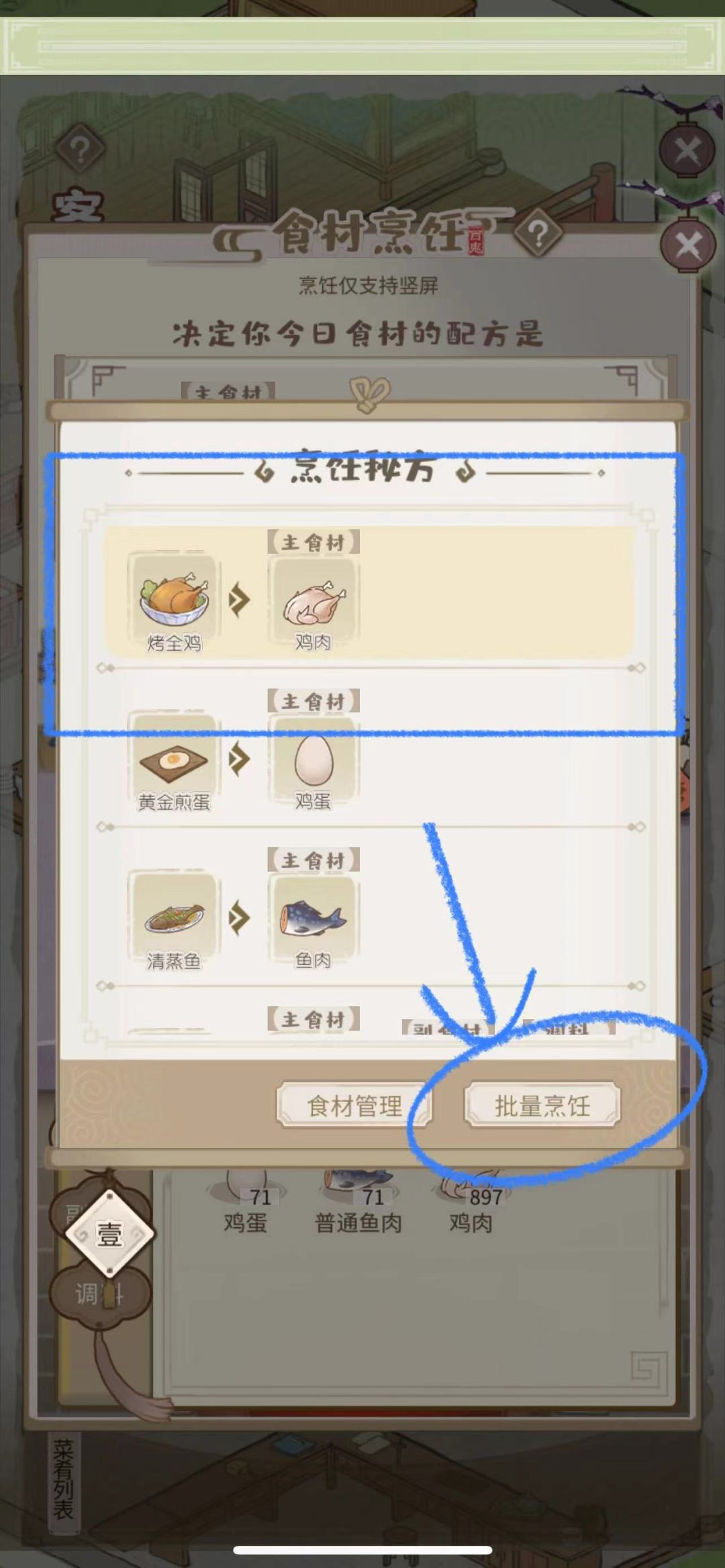 这里说一下为什么要喂饲料:因为我算了一下,不喂饲料的鸡长大是《瘦鸡》,可以在肉摊做15份鸡肉,鸡肉到客栈做成菜,可以到集市卖40一份 一只鸡=15*40-50(鸡仔成本)=550 一只鸡喂饲料长大是《极品鸡》可以做45份鸡肉,长大大概一只鸡需要6个饲料,一个饲料100 45*40-50(鸡仔)-600(饲料)=1150 显而易见,其实喂饲料来钱更多,但是因为我只有俩个鸡倌,就只有俩个养鸡场可以喂饲料(自己懒得手动喂)