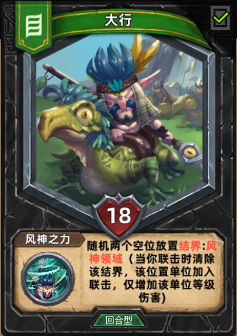 英雄技能【风神之力】可以每回合将两个格子变为结界,在自己联击时消去所有结界中的单位(不论敌我),并对对方造成消去单位累计等级的额外伤害。