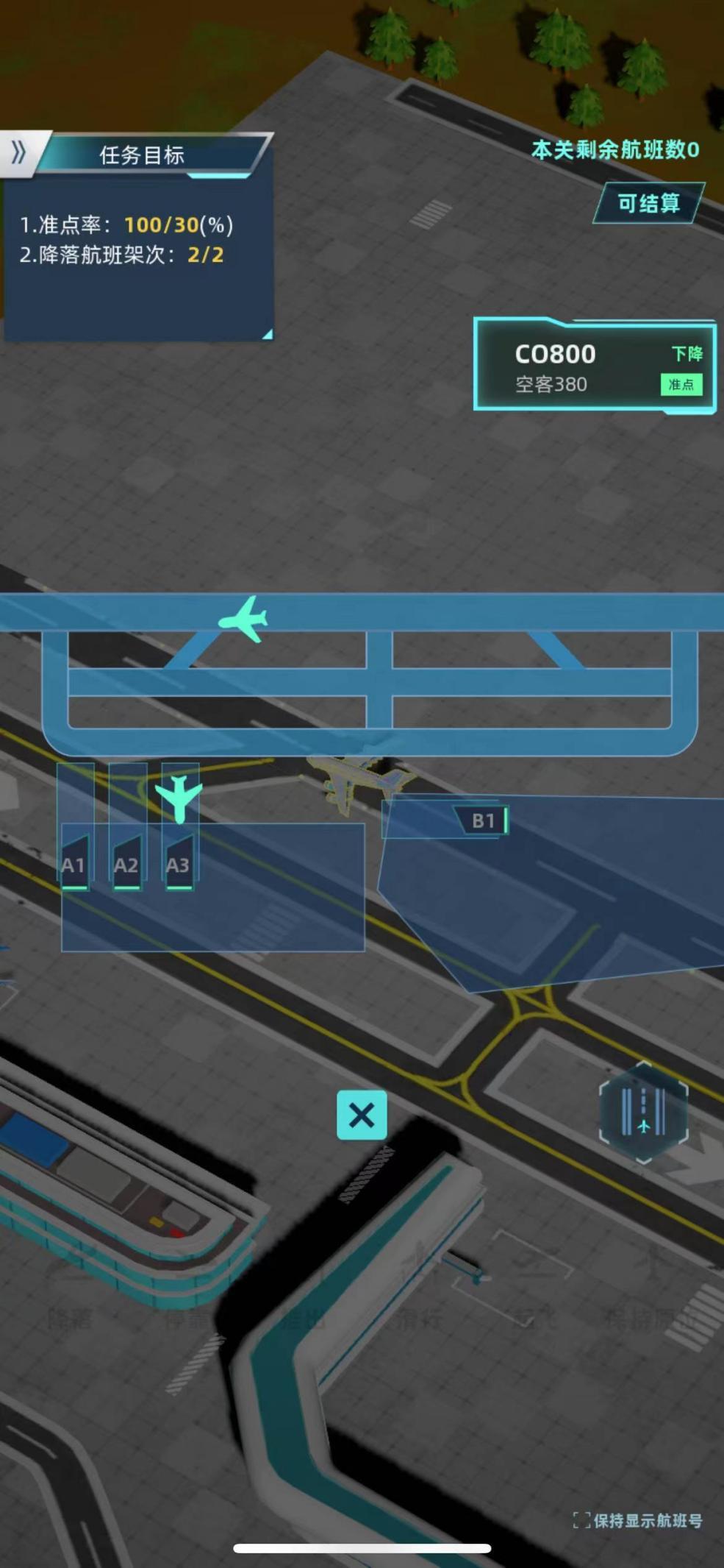 飞机的调度分为起飞和降落两个模块,完成调度需要跟着流程走,需要注意的是左上角的任务目标有时并不是此次调度的全部内容。完成任务目标后可以多多注意右上角“本关剩余航班数”,若不为0则代表还有其他飞机需要起飞降落。老板可以选择直接通关,不过完成任务之外剩余航班的进离场,是可以获得额外的钻石奖励哦!