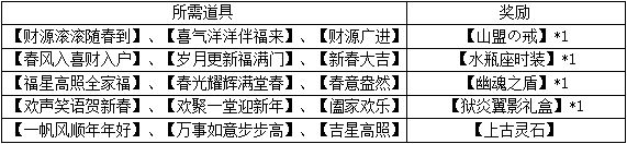 【活动内容】:活动期间,玩家可通过登录奖励和限时商店【新年对联红包】,打开【新年对联红包】有几率获得不同的对联、横批,玩家需将对联和横批正确组合才可以兑换奖励。