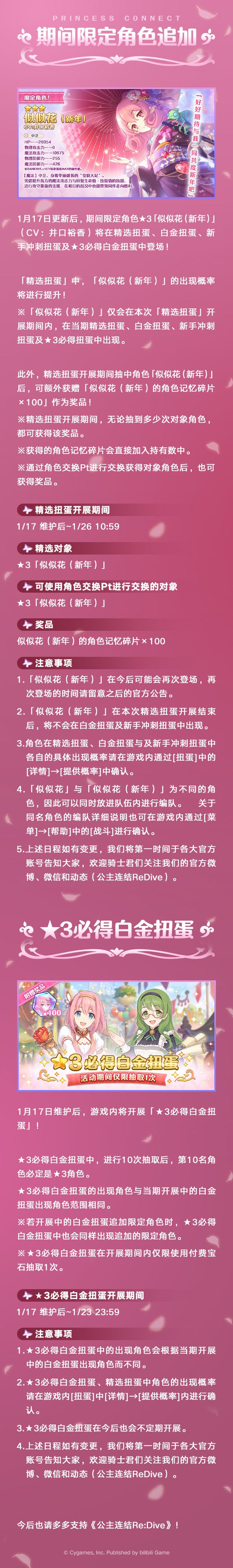 维护结束后,期间限定角色★3「似似花(新年)」(CV:井口裕香)即将登场!游戏内将同时开启「似似花(新年)」精选扭蛋;同时,还将开展★3必得白金扭蛋;公会之家将限时复刻「柔软蓬松」冬季主题家具;回忆留声机将追加新的背景音乐;大师商店将上架新的商品道具,并追加新的游戏内容!