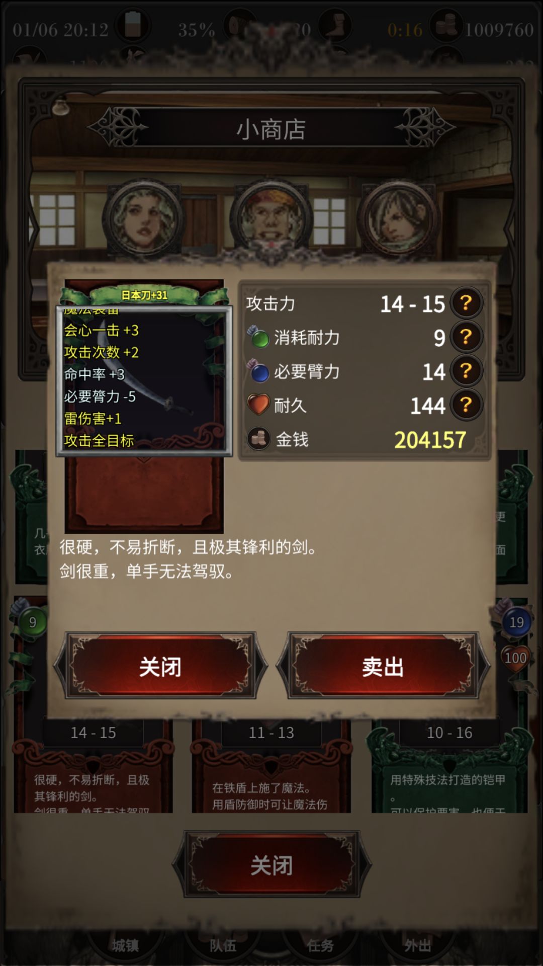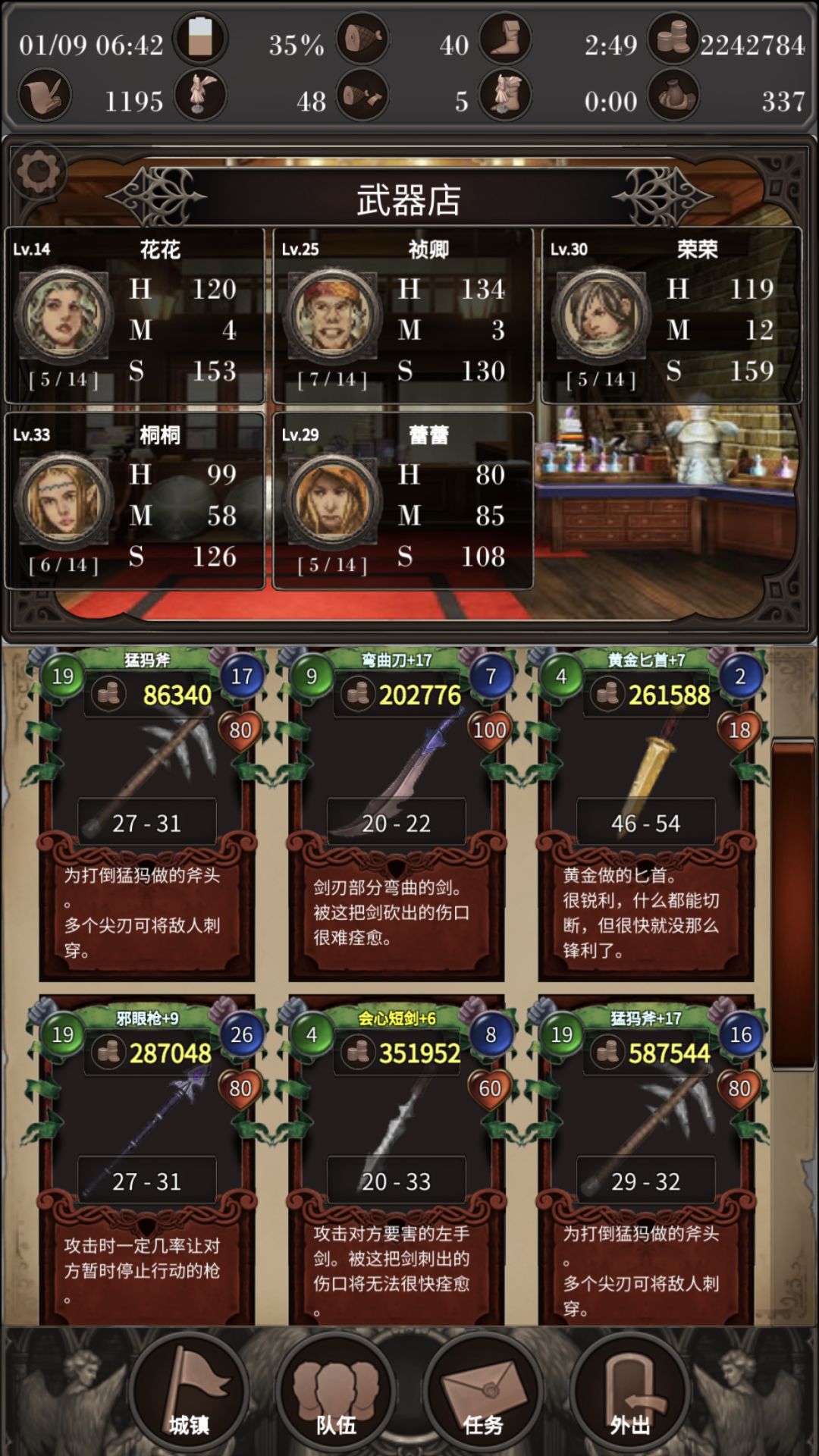 中前期不需要特别的装备,有啥用啥。近战需要高攻多次武器,有魔法属性更好,再有全体攻击属性的为最佳;物理远程需要高攻回血;法系加魔力最多者为上品,毕竟需要靠法杖敲人这种时候,你基本就在濒死边缘来回横跳了。需要注意的是,多次攻击武器一定要看耐久度(蓝色数字)!!!再好的武器,耐久没了,就真的没了... ...+4+6看着爽,用着也很爽,刚爽几下,就坚持不下去了... ...