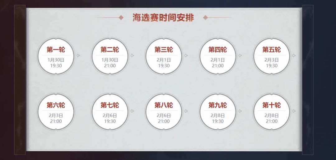 在1月30日~2月8日,参赛玩家将根据等级分为精锐、勇武、神威三大组别,分开进行十轮海选赛。在海选赛结束后,排行榜前128名的队伍晋级天冲组小组积分赛,第129至256名的队伍则将晋级地魁组小组积分赛,并于2月13日、15日、17日,以四支战队为一组,打响三轮小组积分赛。