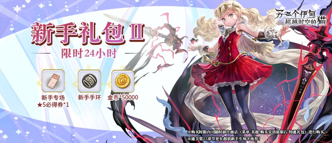 更新前,已通关主线第25章节的玩家,更新后首次登录24h内限时出售,玩家可进入特惠礼包商店(菜单-其他-购买克洛诺斯石-购买特惠礼包)进行购买。