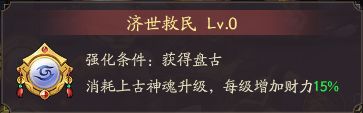 第二个技能,济世救民,每升1级会提升盘古百分之15的财力值,升级是要消耗10个上古神魂的,上古神魂就是兑换上古传说门客的道具10个可以换一个门客,应该先全部兑换激活百分之125之后在去看要不要升级这个技能,一级之增加百分之15少太多了。