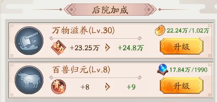 经营都是后院加成的属性,是在进入家族之后才有后院的,升级的材料消耗都是后院产物贩卖之后的资源,万物滋养是增加赚速的升级消耗灵豆,农作物贩卖就可以获得,百兽归元升级可以增加1的资质,升级消耗兽元,贩卖养的动物获得。