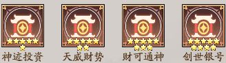 资产管理、融资古王、远古商团、神迹投资、天威财势、财可通神和创世银号都是增加钱庄赚速的资质。这里的星级倍数是40倍,创世银号是9星资质,如果派遣钱庄的话会额外提升200倍的赚速,财可通神是8星派遣钱庄也会增加80倍的赚钱,天威财势是7星资质,委派钱庄也会增加30倍的赚钱,神迹投资是6星资质委派钱庄的话也会增加10倍的赚钱,远古商图是5星资质,委派钱庄的话会额外增加2倍的赚钱。一共就是362倍的钱庄赚速,委派钱庄是最多赚钱倍数的还是委派钱庄比较好。