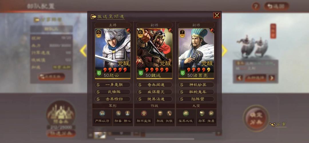 接下来上实战对抗战报:(战法经过调整,给赵云带威谋糜亢,诸葛亮带武锋阵!)