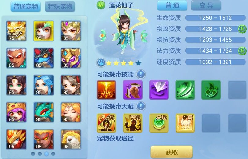 莲花仙子,初始可能携带技能:地狱烈焰,高级报复,法术波动,法术暴击,驱神。