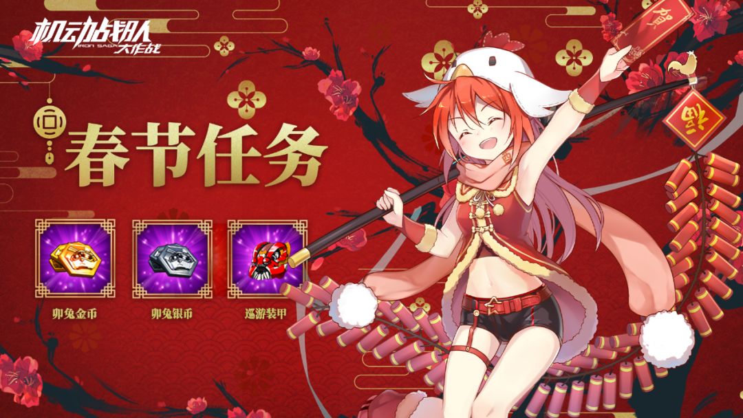本次春节任务分为每日任务和成就任务,每日任务完成后可获得:活动代币【卯兔银币】和活动代币【巡游装甲】。完成春节任务中的所有成就任务可以获得:活动代币【卯兔金币】和活动代币【卯兔银币】。