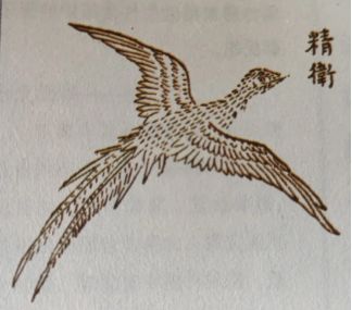《山海经 · 北山经》:又北二百里,曰发鸠之山,其上多柘木。有鸟焉,其状如乌,文首、白喙、赤足,名曰精卫,其鸣自詨。是炎帝之少女,名曰女娃,女娃游于东海,溺而不返,故为精卫。常衔西山之木石,以堙于东海。漳水出焉,东流注于河。