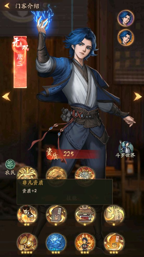 唐三,唐三是卓越门客的,他有个皮肤穿上之后就是无双门客了,但是他的资质还是2星的资质,大师资质都是3星的,卓越门客都是2星的非凡资质,优秀和普通的门客都是普通资质一星。3星的资质升级获得的赚速会更高,因为基础属性都是+3的后面用后面用资质丹进行升级星级虽然不会变但是资质会加,也可以用市井百业书籍经验升级。