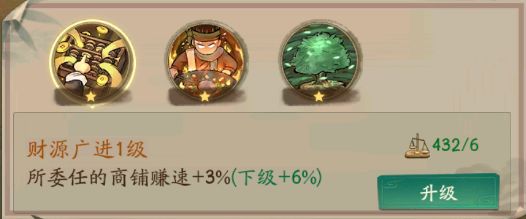 门客委任,这个技能加赚速是非常的快的,会增加门客所委任的商铺赚速而且是百分比的赚速加成。需要消耗算盘来进行升级。门客委任的有个小技巧,等级高的尽量往基础赚速比较高的商铺上委任。