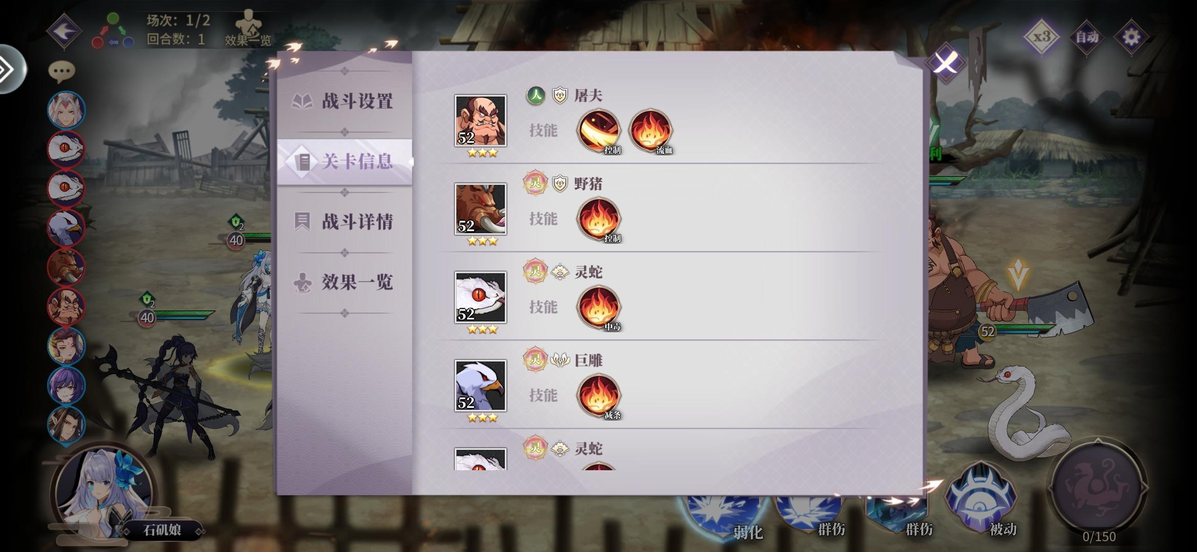 可以点开查看技能,屠夫是第一波的小boss,它的伤害最高,所以要想办法把它先噶了,小怪则依靠石矶和朱雀的群攻削减血量,最后普攻带走