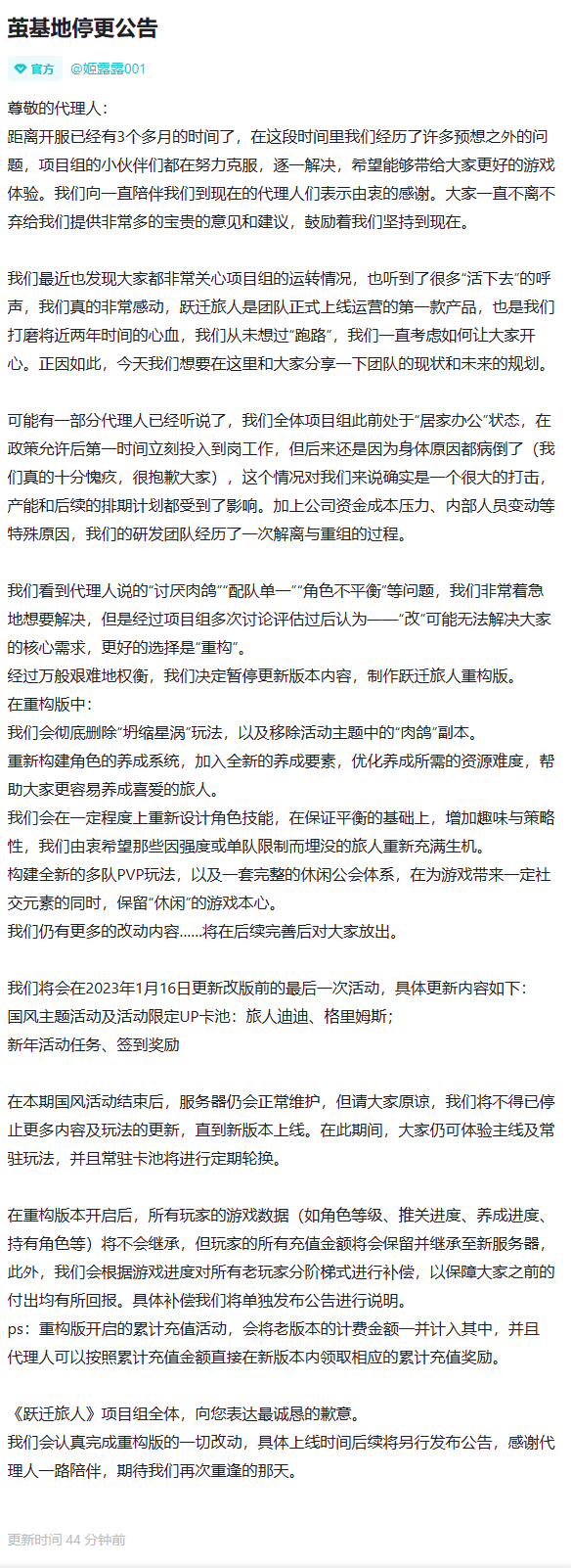 今日下午,由二元游戏自研自发,正式上线运营3个多月的《跃迁旅人》发布公告称:由于疫情居家办公、公司资金成本压力、内部人员变动等多种原因的影响,项目研发团队已经经过了一次重组。 而面对玩家对于产品提出的种种意见,团队认为小修小改已经无法满足用户需求,于是决定暂停游戏未来的版本内容更新,制作《跃迁旅人》重构版——删除部分玩法,重新构建角色的养成系统,优化资源循环,重新设计角色技能,并增加全新的多队PVP玩法、休闲公会体系等。 2023年1月16日,将会是游戏最后一次版本更新。团队表示重构期间游戏服务器会照常维护,重构版上线后玩家的所有数据将会重置,只保留玩家的充值金额,并会根据游戏进度对所有老玩家进行分阶梯式补偿。 《跃迁旅人》在上线首日冲到了App store免费榜第一,畅销榜Top 20。但游戏随后很快就断崖式掉到了几百名开外,目前已经不在榜单之中。