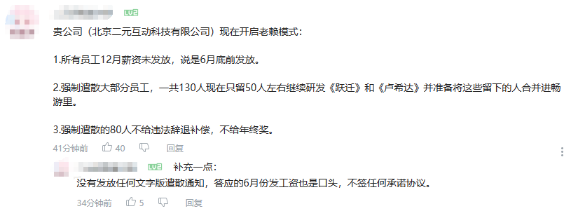 类似的重构案例,此前还有游族的《山海镜花》,公告内容大同小异,同样也不会继承账号数据。该游戏从进入重构期到宣布回归,大概用了两年时间,期间产品下架过两次,并传出项目组解散的消息。在最新的公告中,官方称负责《山海镜花》后续开发的将会是一支全新团队,还需要更多开发时间。 由此可见,《跃迁旅人》重构版也将面临相当大的挑战,能否顺利面世还要打个问号,包括即将到来的舆论风暴——从目前的玩家反馈来看,愤怒和失望占了大多数。另外在B站的官方公告评论区,一名疑似离职员工的用户称二元互动强制遣散了80名左右的员工,并且未给补偿,游戏未来将合并进畅游。 不过该消息并未得到证实,大家需要自行判断真伪。