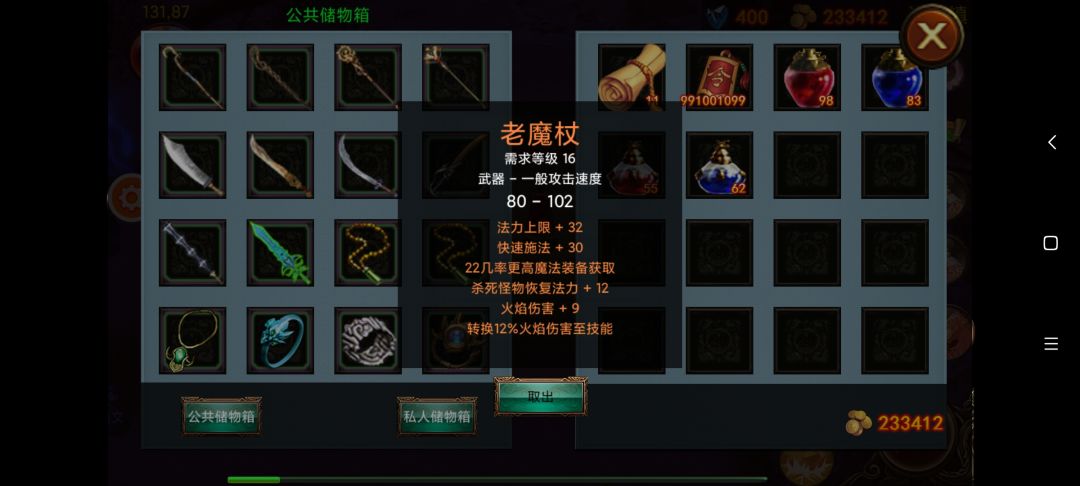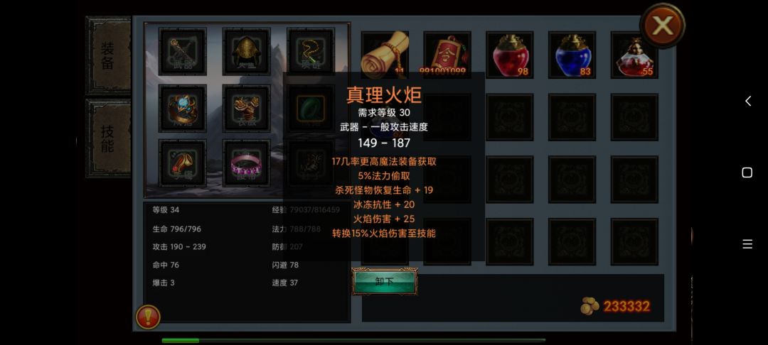 另一件属性非常优秀的武器是老魔棒,同时提供了施法速度、火焰伤害、火焰转化、暗金爆率,整整四个实用的属性,而且16级就能用,简直性价比之王,如果不是我这把真理火炬自带了17%暗金爆率,我还会坚持带老魔杖。